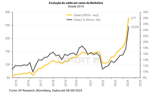 Com essa onda de vendas, o saldo em caixa da BRK salta para US$ 277 bilhões, um recorde para a holding tanto em termos absolutos quanto em termos de percentual dos ativos totais, chegando a 25%. Boa parte desse caixa está, obviamente, aplicado em títulos do governo, em especial nas T-bills (saiba o que são aqui). Com um saldo de US$234,6bi nessas emissões do Tesouro americano, a Berkshire detém mais desses títulos do que o próprio Fed, que ao final de julho detinha US$195,3bi (fonte).