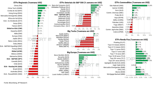 Ao longo da semana, a TSMC (Ticker: TSM) registrou uma queda de -2,8%, enquanto a Broadcom (Ticker: AVGO) apresentou uma desvalorização de -6,2%. Em contrapartida, a Intel teve um desempenho positivo, com uma alta de +5,4% na semana, uma vez que, caso o negócio se concretize, é provável que a TSMC e a Broadcom ofereçam um prêmio em relação ao valor de mercado da empresa, considerando as sinergias que seriam geradas.