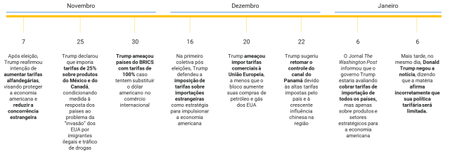 O maior temor associado a um governo Trump é a possibilidade de imposição de tarifas universais, um dos pilares da campanha de 2024. Entretanto, uma matéria do Washington Post, publicada na segunda-feira (6), indicou que seus assessores poderiam limitar essas tarifas a setores críticos, como defesa, suprimentos médicos e energia, o que representaria uma flexibilização em relação ao inicialmente anunciado pelo presidente eleito, que rapidamente desmentiu a informação, classificando-a como fake news. A questão fortaleceu a hipótese de que as tarifas serão utilizadas como uma ferramenta de negociação pelos EUA, e que a reação de Trump seja temor de enfraquecer o poder de barganha dos EUA.