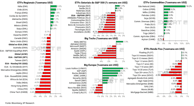 Os mercados de ações foram fortemente impactados pela abertura da curva de juros americana (a qual chamamos de mãe de todas as curvas): O SPY (ETF representativo de S&P 500) fechou em queda de -1,9%, enquanto o QQQ (ETF de Nasdaq 100) caiu -2,2%. Apesar do movimento de queda, mantemos a recomendação de alocação abaixo do neutro em ações dos EUA, considerando nível de múltiplos, risco fiscal e nossa expectativa de que big techs terão performance inferior ao restante da bolsa em 2024.