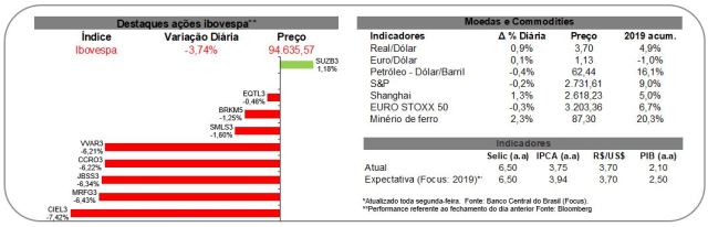 - Em teleconferência, a BRF reiterou o foco na contínua desalavancagem e a expectativa de fluxo de caixa positivo em 2019. Além disso, a empresa espera melhoria dos resultados operacionais com reversão da queda de margem esse ano e volta à média histórica em 2020. O mercado doméstico já apresenta melhora, com preços mais robustos, enquanto a empresa poderia buscar parcerias para investir na Europa e na Arábia Saudita. Não há previsão de investimentos inorgânicos nos próximos 3 anos – apenas investimentos para manutenção e melhorias operacionais. Por fim, a empresa reiterou que está confortável com sua situação de caixa e que não precisará de caixa adicional após as inciativas alcançadas;