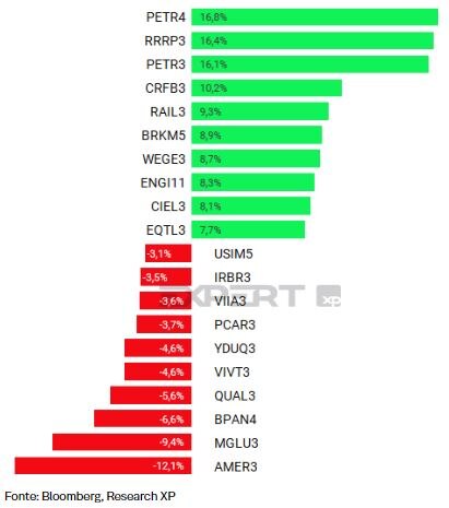 - Nós continuamos enxergando a Bolsa brasileira como atrativa, e mantemos os 120 mil pontos de valor justo para o final do ano. Nós vemos uma série de setores e papéis com histórias sólidas negociando a patamares de valuation bastante baixos;