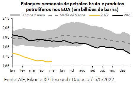 O gráfico apresenta nosso indicador preferido dessa tendência: estoques globais semanais dos EUA de petróleo bruto, que inclui reservas estratégicas e outros produtos petrolíferos. A curva amarela representa o estoque em 2022, que está em seu nível mais baixo dos últimos cinco anos. Esse recuo indica força nas exportações, principalmente para território europeu, além da liberação de parte do estoque numa tentativa de contenção dos preços do petróleo.