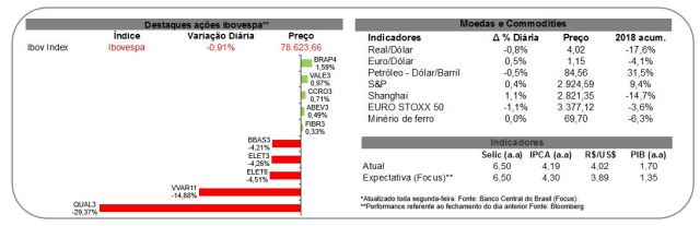- As ações da Via Varejo caíram 14,9% ontem e acumulam queda de 23% desde a última sexta-feira, seguindo expectativa de resultados fracos no 3T18, com margens pressionadas devido à: (1) aumento de promoções no online e (2) vendas impactadas por problemas com o novo software recém implementado nas lojas;