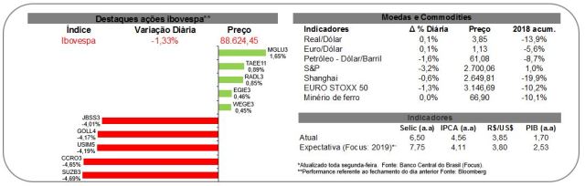 O S&P teve forte dia de correção ontem, com receio do desfecho das negociações entre os EUA e China, assim como curva de juros que pode estar invertendo (historicamente isso antecede uma recessão).