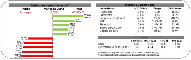 Após forte correção dos últimos meses, acreditamos que boa parte do risco já esteja refletido. Apesar da falta de gatilhos no curto prazo, o próximo potencial sendo acordo comercial entre os EUA e China, mantemos visão mais construtiva para mercados emergentes em 2019, dentro deles, destaque para o Brasil.
