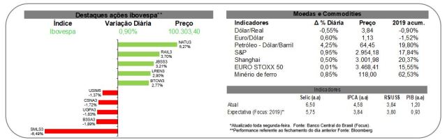 O Banco Central americano, Fed, manteve na quarta-feira a taxa de juros dos EUA em 2,25-2,50%, mas sustentou que as incertezas continuam altas, frente à desaceleração do crescimento global e guerra comercial, com um discurso que ficou longe do “neutro” e sinalizou cortes futuros, aumentando o otimismo do mercado.