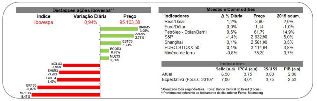 Ainda no Brasil, o presidente do BC destacou que a política monetária está em campo expansionista, mas que poderia ser mais intensa, dando a entender que há espaço para um potencial corte de juros. Entretanto, na nossa visão, essa discussão deve ficar para o segundo semestre, a medida que a aprovação ou não da reforma da previdência é crucial para determinar o nível de política monetária neutra.