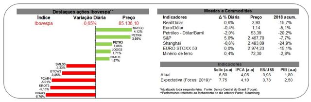 No âmbito doméstico, o noticiário continua pouco movimentado, com jornais destacando que o governo Bolsonaro focará durante o mês de janeiro em anunciar medidas para reduzir burocracia e deverá focar em reformas estruturais como a da Previdência e Tributária apenas a partir de fevereiro, após o Congresso tomar posse.