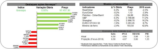 - Ainda que em linha com as expectativas, os resultados do PIB do primeiro trimestre devem reforçar a preocupação do mercado com relação ao ritmo da recuperação da atividade. Para que a economia encerre o ano com crescimento de 1,2% (média do mercado medida pelo Focus), é necessário que o PIB apresente um crescimento médio trimestral de 0,6% até o final de 2019. Este cenário, até o momento, não parece provável, uma vez que as incertezas quanto à continuidade da agenda reformista e à sustentabilidade da dívida pública seguem elevadas.