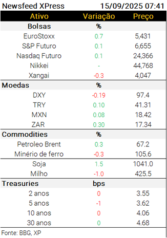 Agenda local de dados: Às 8h25 o BCB publica o PDF do Focus e às 9h, os dados completos. Também às 9h teremos o IBC-Br de julho, com o mercado antevendo variações de -0,3% m/m e 1,4% a/a, e a XP, de -0,5% m/m e 1,3% a/a.