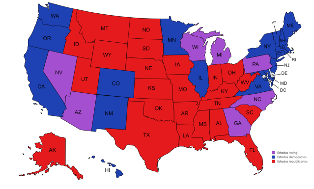 Swing States: Os ‘swing states’ têm um papel essencial nas eleições americanas. Como o próprio nome diz eles atuam de forma pendular. Enquanto outros estados costumam votar pelo mesmo partido ano a ano, os ‘swing states’ mudam de preferência frequentemente.