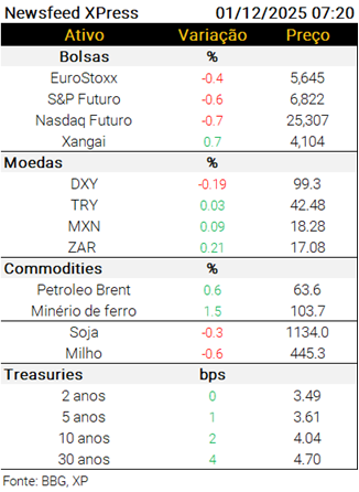 O presidente Donald Trump disse já ter escolhido o próximo presidente do Fed e que o anúncio será feito “em breve” – evitando confirmar se o indicado será Kevin Hassett, atual diretor do Conselho Econômico Nacional (https://tinyurl.com/bdfcmzze). Destaque também para fala do presidente do Banco Central do Japão, Kazuo Ueda, na qual afirma que irá considerar os “prós e contras” a um aumento das taxas de juros na próxima reunião de política monetária, sinalizando a possibilidade de a elevação acontecer ainda este mês (https://tinyurl.com/2u2nxtwp).