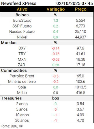 Lá fora, os jornais seguem dando destaque para o shutdown do governo dos EUA (https://tinyurl.com/yc7tfkmw), que já faz as agências federais do país sentirem os primeiros impactos da paralisação (https://tinyurl.com/2w73hvy2).