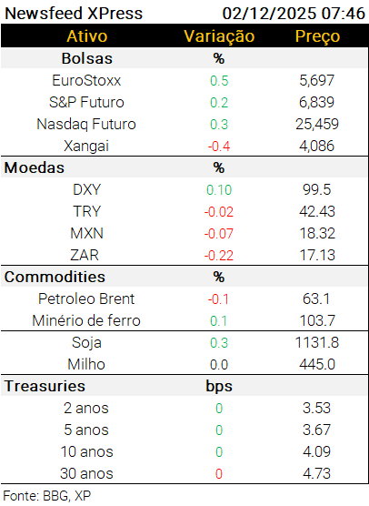Agenda local de dados: Hoje tem PIM de outubro, às 9h (est 0,5% m/m e XP 0,7%). Às 10h30 o Tesouro divulga o edital do leilão de NTN-B e LFT. Segundo a agenda da Bloomberg, está prevista para hoje a divulgação dos dados de novembro da Fenabrave sobre vendas de veículos, mas sem horário definido.