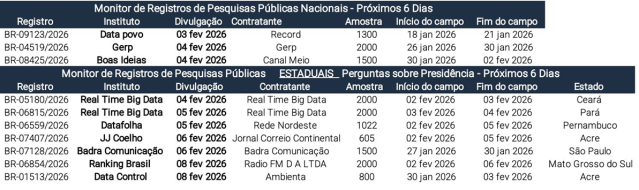 Monitor de pesquisas: Pesquisa nacional conduzida pelo Data Povo pode ser divulgada a partir de hoje, enquanto levantamentos de Gerp e Ideia podem sair a partir de amanhã.