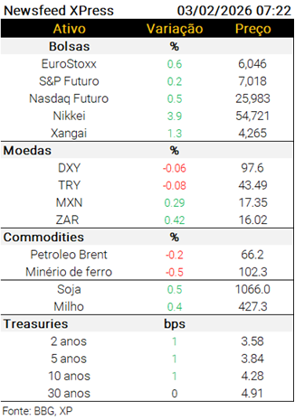 Agenda local de dados: Hoje o BC divulga a ata do Copom, às 8h, e o IBGE publica dados da produção industrial de dezembro (est -1,1% m/m e 0,5% a/a; XP -2,3% m/m e -0,5% a/a).