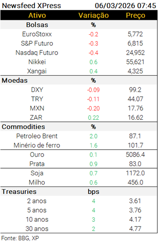 Agenda local de dados: Às 8h a FGV divulga o IGP-DI de fevereiro (exp. -0,64% m/m e -2,70% a/a). Às 9h o IBGE publica a PIM de janeiro, com o mercado e a XP antevendo variação de 0,7% m/m e -0,8% a/a. Às 11h teremos os dados da Anfavea de produção de veículos no mês passado.