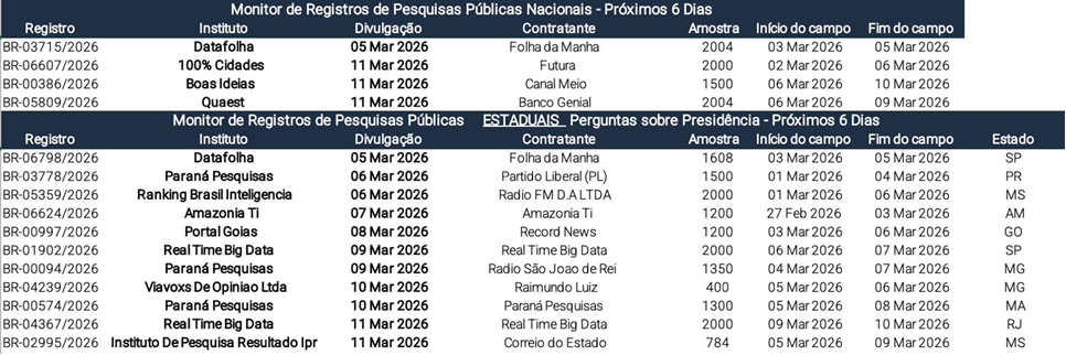 Monitor de pesquisas: Pesquisa Datafolha teve publicação permitida ontem, mas ainda não foi divulgada. Para a próxima semana, levantamentos de Quaest, Futura e Boas Ideias podem ser apresentados a partir de quarta.