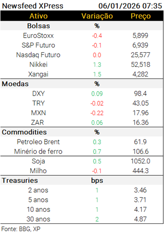 Agenda local de dados: O PMI de serviços dezembro será divulgado às 10h e os editais do leilão de NTN-B e LFT serão publicados às 10h30 pelo Tesouro Nacional. O MDIC divulga a balança comercial fechada de 2025 às 15h (est 7,1 bi para dezembro).