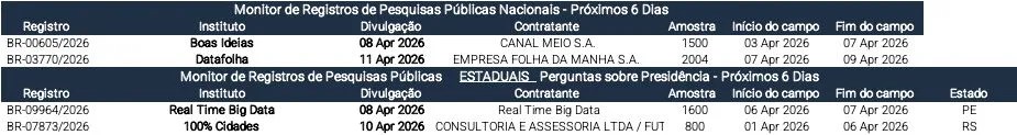Monitor de pesquisas: Pesquisas conduzidas pelos institutos Boas Ideias e Datafolha podem ser divulgadas a partir de amanhã e sábado, respectivamente.