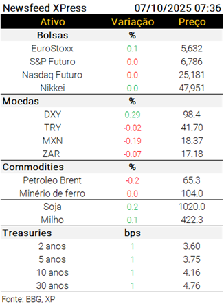 Agenda internacional de dados: Na Alemanha, as encomendas às fábricas recuaram 0,8% m/m (est +1,2%). Nos EUA, haveria apresentação dos dados da balança comercial de agosto, às 9h30, mas a divulgação pode ser impactada pelo shutdown. O FED publica os dados de crédito de agosto, às 16h (est 14 tri), e teremos 5 FED speakers.