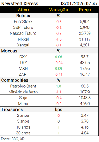 Agenda local de dados: Às 8h a FGV divulga o IGP-DI de dezembro (exp. 0,18% m/m e -1,15% a/a). Às 9h o IBGE publica a PIM de novembro (Consenso: 0,1% m/m e -1,0% a/a; XP: -0,1% m/m e -1,3% a/a). Às 10h30 o Tesouro divulga os editais do primeiro leilão de pré-fixados do ano.