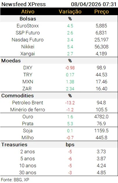 Após a sequência de ameaças, o presidente Donald Trump anunciou na noite de ontem um cessar-fogo bilateral de duas semanas com o Irã. Em troca, os iranianos concordaram com a reabertura do Estreito de Ormuz durante o período, que será usado para discutir um acordo definitivo para o encerramento da guerra (https://bit.ly/4mejmjE).