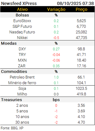 Agendas de Lula e Haddad: Lula participa de conferência pelo meio ambiente, às 10h, e sanciona o PLV que institui o programa Luz do Povo, às 15h. Também se reúne com o presidente do CA da Gerdau, às 16h, e com os ministros Rui Costa e Alexandre Silveira, às 17h. Haddad participa do lançamento do 3º Leilão Eco Invest, seguido de coletiva à imprensa, às 14h.