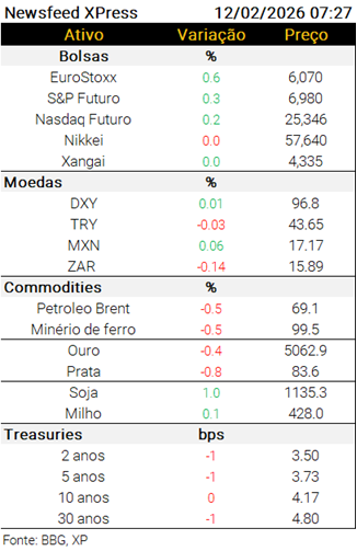 Agenda local de dados: O IBGE publica pesquisa mensal de serviços de dezembro, às 9h (est -0,1% m/m e 3,5% a/a; XP zero m/m e 3,5% a/a). Às 10h30 o Tesouro publica o edital do leilão de pré-fixados.