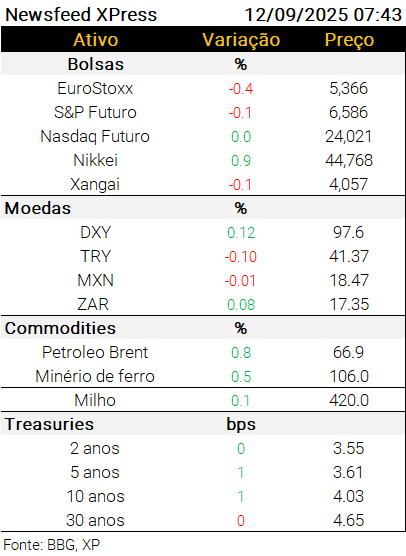 Agenda internacional de dados: No Japão, os dados finais de julho apontaram queda na produção industrial de 1,2% m/m e de 0,4% a/a. Na Alemanha, a leitura final do CPI de agosto indicou alta de 0,1% m/m e 2,2% a/a, conforme a prévia e as expectativas do mercado. No Reino Unido, o PIB de julho ficou estável, em linha com as expectativas, enquanto a produção industrial caiu 0,9% m/m (exp. 0,0%).