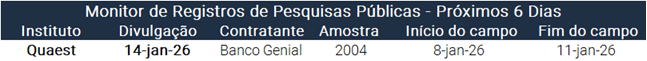 Um pouco mais cedo, foi divulgada pesquisa Boas Ideias, primeira sondagem registrada no TSE a ser publicada em 2026. Lula lidera todos os cinco cenários de primeiro turno. Em segundo turno, Flávio tem desempenho pior do que Tarcísio e Michelle contra o atual presidente. Veja os dados completos aqui (app: https://bit.ly/4qpvIXu e desktop: https://tinyurl.com/yjud5xcu).