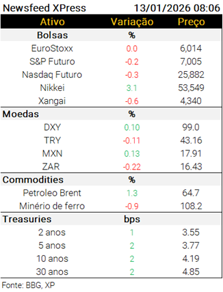Já os ativos japoneses reagem nesta manhã a notícias de que eleições poderiam ser convocadas em breve pela primeira ministra Sanae Takaichi (https://tinyurl.com/3n4cpah2) – o JPY deprecia 0,4%, os yields dos bonds de 10 anos abrem 8 bps, enquanto o Nikkei avançou 3%.