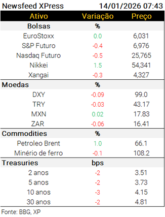 Além disso, a Suprema Corte americana divulga hoje novas pautas que serão julgadas, com possibilidade de inclusão do processo sobre as tarifas, que não entrou na pauta da última sexta-feira (https://tinyurl.com/56x8r2wn).