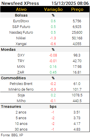 Agenda local de dados: Hoje teremos IGP-10 de dezembro, às 8h (est 0,05% m/m), Focus, às 8h25, e IBC-Br de outubro, às 9h (est 0,1% m/m e 0,65% a/a; XP 0,2% m/m e 0,8% a/a).