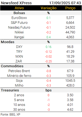 Nos EUA, às 9h30 teremos os dados de iniciação de casas novas e concessões de alvarás, ambos referentes a agosto. Já as 15h, o FOMC publica seu comunicado com a decisão de política monetária, para a qual há um amplo consenso por um corte de 25 bps – o mercado estará especialmente atento aos dissensos. No mesmo horário, o Comitê divulga seu sumário de projeções macroeconômicas. Já às 15h30, Jerome Powell concede entrevista coletiva.