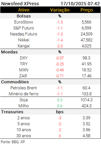 Os futuros das bolsas americanas novamente operam em queda reagindo à preocupação com a situação do crédito nos EUA – ontem dois bancos regionais americanos disseram ter sofrido calotes relacionados a uma suposta fraude (https://tinyurl.com/smwzzck3).