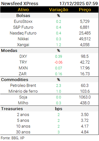 Agenda internacional de dados: No Reino Unido, o CPI de novembro variou -0,2% m/m e 3,2% a/a no headline (est 0% m/m e 3,5% a/a) e 3,2% a/a no núcleo (est 3,4%). Na Alemanha, o IFO de dezembro marcou 87,6 pontos (est 88,2). Na Zona do Euro, o CPI final de novembro variou 2,1% a/a (est 2,2%) com núcleo em 2,4% a/a (est 2,4%). Nos EUA teremos 3 FED speakers e emissão de títulos de 20 anos pelo Tesouro.