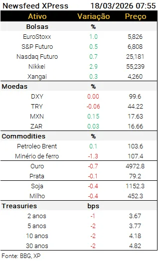 Nos EUA, às 9h30 será divulgado o PPI de fevereiro. Às 15h o FOMC publica sua decisão de política monetária, com ampla expectativa por manutenção dos juros. Além do comunicado, o Comitê atualizará suas projeções econômicas e a maioria do mercado espera que a mediana aponte para um corte de juros em 2026. Às 15h30, Jerome Powell concede  entrevista coletiva.