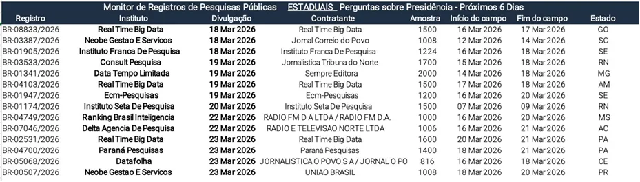 Monitor de pesquisas: Sem pesquisas nacionais registradas no TSE.