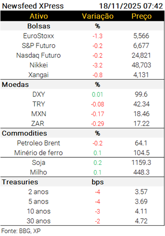 Agenda internacional de dados: Nos EUA, tem NAHB de novembro (est 37) e dados de encomendas às fábricas (est 1,4%) ainda de agosto ao meio-dia e 3 FED speakers.