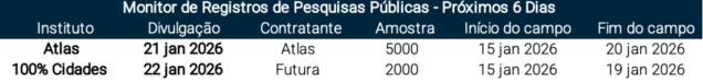 Nesta segunda, o senador embarca para Israel, seu primeiro destino neste ano eleitoral, onde participará da Conferência Anual de Combate ao Antissemitismo, entre os dias 26 e 27 de janeiro – evento que terá a participação do primeiro-ministro israelense Benjamin Netanyahu e de Eduardo Bolsonaro (https://tinyurl.com/3tawf5jw). A agenda também contará com idas a Bahrein, Emirados Árabes e, possivelmente, alguns países da Europa. Segundo interlocutores, o objetivo é estreitar relações com outros líderes de direita pelo mundo, antes de circular por estados brasileiros (https://tinyurl.com/mwtr6y7d). Folha e Metrópoles ainda afirmam que aliados de Flávio passaram a considerar o nome de Guilherme Derrite, ex-secretário de Segurança Pública de São Paulo, para o posto de vice-presidente em sua chapa, com o objetivo de reforçar a bandeira da segurança ao longo da campanha eleitoral (https://tinyurl.com/ybsv3y26 e https://tinyurl.com/4mxt4m2c).