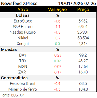 O presidente Donald Trump prometeu no sábado impor tarifas crescentes, a partir de 1º de fevereiro, a aliados da Otan que se opõem à proposta de anexação da Groenlândia pelos Estados Unidos (https://tinyurl.com/zm5vwtcm). Como resposta, as capitais da União Europeia estariam considerando impor tarifas no valor de 93 bilhões de euros aos EUA, ou restringir empresas americanas do mercado do bloco (https://tinyurl.com/4z6k84c9).