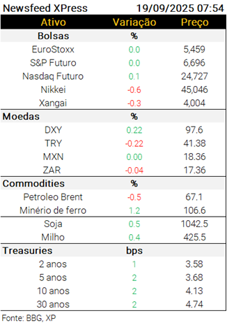 Ainda no Japão, o CPI de agosto subiu 2,7% a/a (exp. 2,8%), com núcleo que exclui alimentos in natura também subindo 2,7% a/a (exp. 2,7%). Na Alemanha, o PPI retraiu 2,2% a/a em agosto (exp. -1,7%). No Reino Unido, as vendas no varejo subiram 0,5% m/m no mês passado (exp. 0,4%). Nos EUA, em dia sem dados relevantes, destaque para duas falas programadas de Stephen Miran, às 12h e às 17h.
