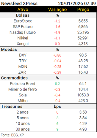 Com feriado ontem nos EUA, os mercados de bolsas à vista e de treasuries ficaram fechados, mas os futuros das bolsas americanas recuaram e o USD depreciou frente aos pares em meio à tensão com a União Europeia, movimento que se estende nessa manhã. Nessa frente, Trump ainda ameaçou impor tarifas de 200% sobre vinho e champanhe franceses, após o presidente Emmanuel Macron descartar entrar no Conselho de Paz proposto por ele. O presidente americano ainda postou em sua rede social mensagem privada enviada por Macron a ele em que, entre outras coisas, diz não entender o que Trump está fazendo em relação à Groenlândia.