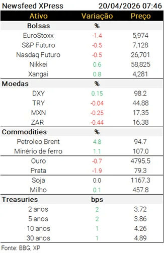 Agenda internacional de dados: A China manteve suas taxas de referência de 1 e 5 anos em 3,00% e 3,50%, respectivamente, conforme esperado. Na Alemanha, o PPI subiu 2,5% m/m em março, frente a expectativa de 1,4% do mercado.