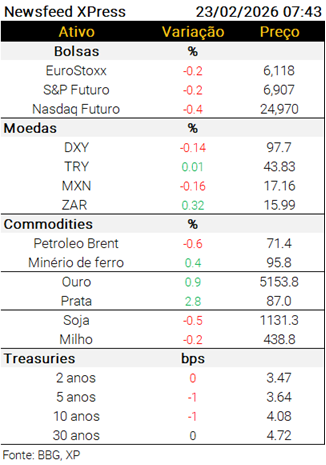 Agenda local de dados: A FGV publica a confiança do consumidor de fevereiro, às 8h. O BC divulga o PDF do Focus, às 8h25, com os resultados completos às 9h.