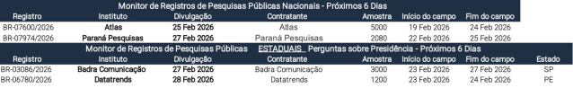 Monitor de pesquisas: Pesquisas nacionais podem ser divulgadas nesta semana a partir de quarta (Atlas) e sexta (Paraná Pesquisas).