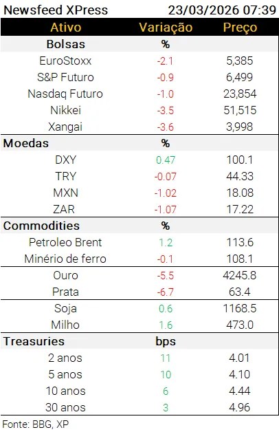 Agenda internacional de dados: Na Zona do Euro, teremos a prévia da confiança do consumidor de março às 12h. Nos EUA, às 9h30 será publicado o indicador de atividade econômica do Fed Chicago referente a fevereiro e, às 11h, os gastos da construção de janeiro.