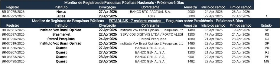 Monitor de pesquisas: Pesquisas conduzidas por Nexus e Atlas podem ser divulgadas a partir de segunda e terça-feira, respectivamente.